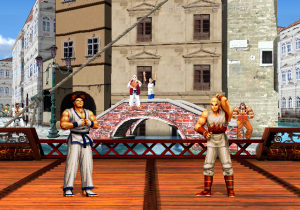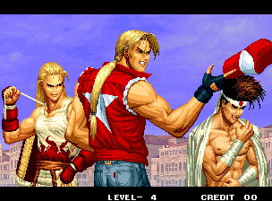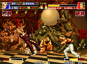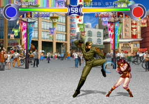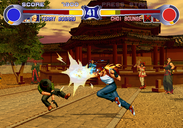 The combat here is made interesting by having the damage your moves do depend upon a gauge that fills up as you block attacks or take damage. You can also charge this gauge at any time by holding down both punch and weak kick buttons. When the meter is full your damage is increased for a time, or you can immediately expend the gauge to perform a very powerful attack (called “Desperation Moves” in the KoF series, or “DMs”). You can also perform these DMs at any time when your life is low, indicated by when your life gauge starts flashing red.