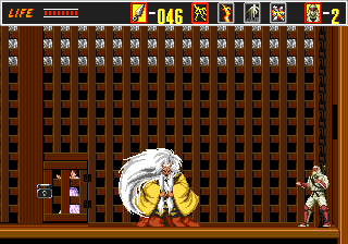 Otherwise the most valuable power-up, the POW icon, grants fiery shurikens, which deal twice as much damage and gives Joe a new sword with a longer range, which he also uses to protect himself against projectiles when walking forward. Take one hit and it’s gone, though. Keeping with its lineage, The Revenge of Shinobi is incredibly difficult, although Easy Mode grants nine lives.