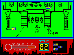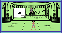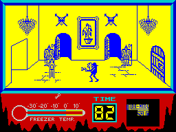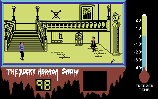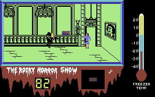 Just for the record, the major differences in the Spectrum and Amstrad versions: the characters are as monochrome as the backgrounds, items are not randomized, and all the Transexual Transylvanians wait quietly in their rooms until the player enters, making the mansion feel deserted and boring instead of frantic and insane. The Rocky Horror Show is also one of the few C64 games that have a dedicated C128 counterpart, with completely redrawn graphics (including the backgrounds) and individual lines for all inhabitants of the mansion, but it runs extremely slow.