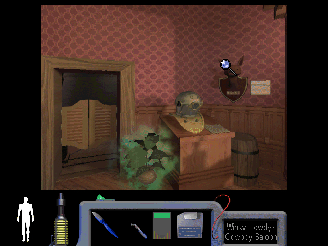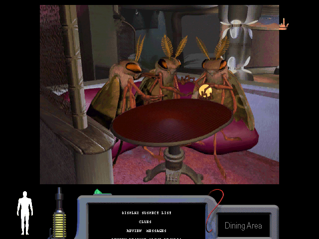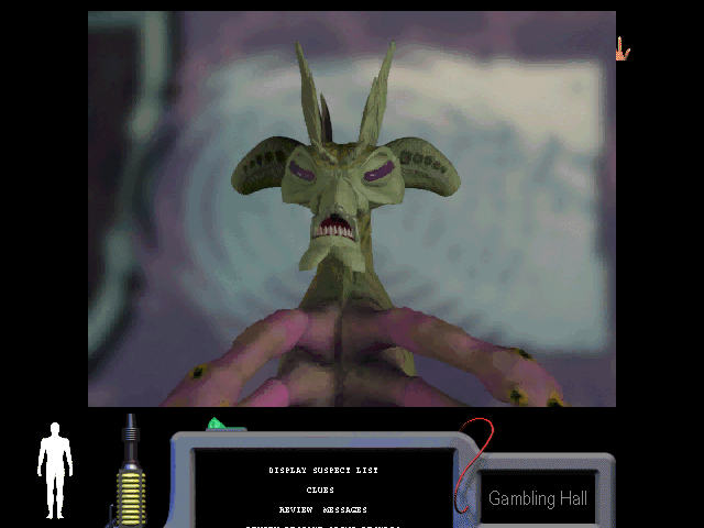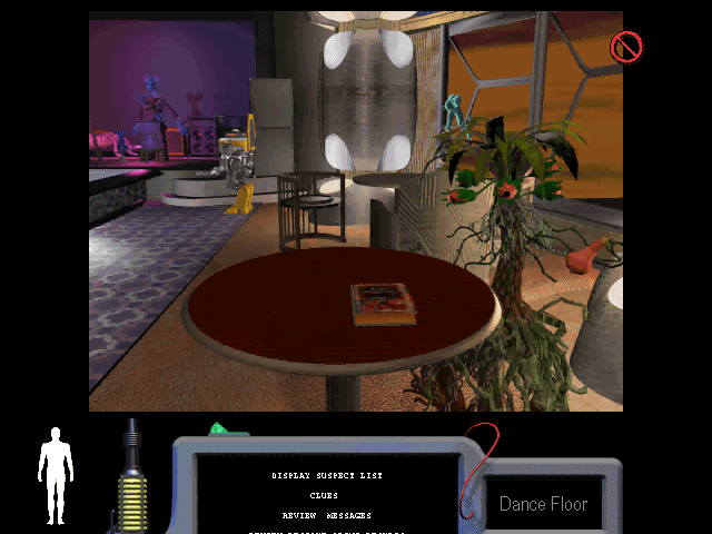Actions taken in the bar itself are on a strict timer, with a four hour time limit. The clock advances by one minute each time you move locations. A few of the mind meld sections are also on such a schedule, but others allow you to take a leisurely pace. The timer gives the game a sense of urgency and allows the plot to advance in an interesting way, but adds an artificial difficulty in trying to complete the game – for instance, some interactions can be missed, and you lose if you haven’t made an arrest by the end of the night.