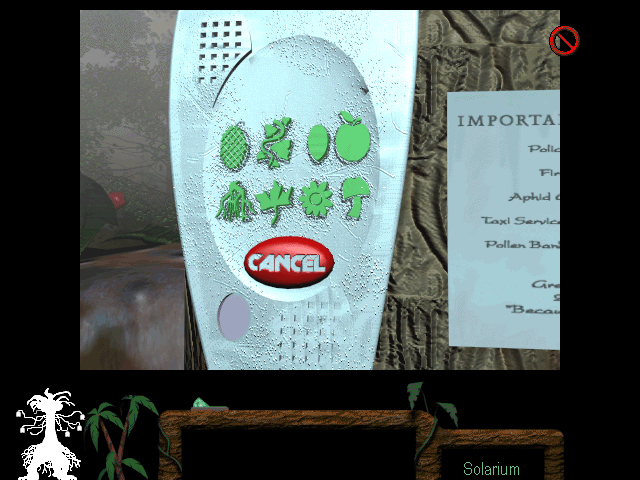 Each larger location is made up of several smaller areas where the player character stands on a fixed point but can turn 360 degrees to look around with a first-person perspective. This is similar to the use of pre-rendered areas in The Journeyman Project 3: Legacy of Time and Zork Nemesis, but is done using panoramic shots and a fisheye lens to simulate perspective. Each location is linked by a nice animated flythrough to represent moving place to place.