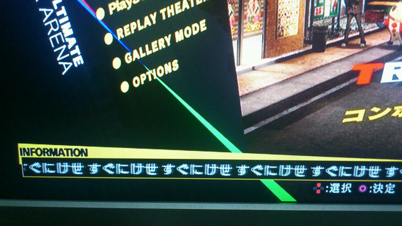 Still, this urban legend was referenced in the Japanese release of Persona 4 Arena. At the menu, there’s a little “information” box that has text that scrolls by. If you tried to play it before the official release date (for example, if a store had broken street date), the text “turn it off now” repeats over and over. I’ve tried this with an American copy, setting it back before either the Japanese or American release, and unfortunately it doesn’t trigger anything special.