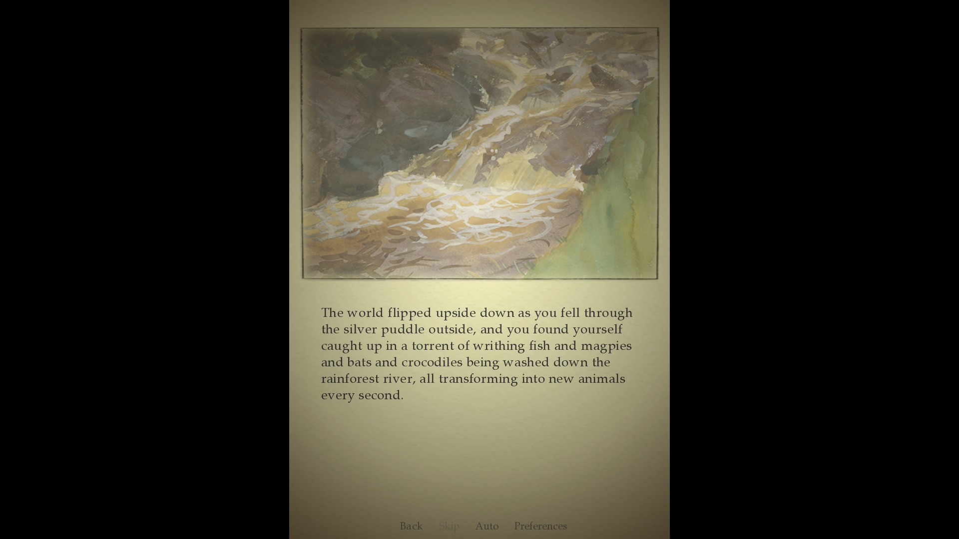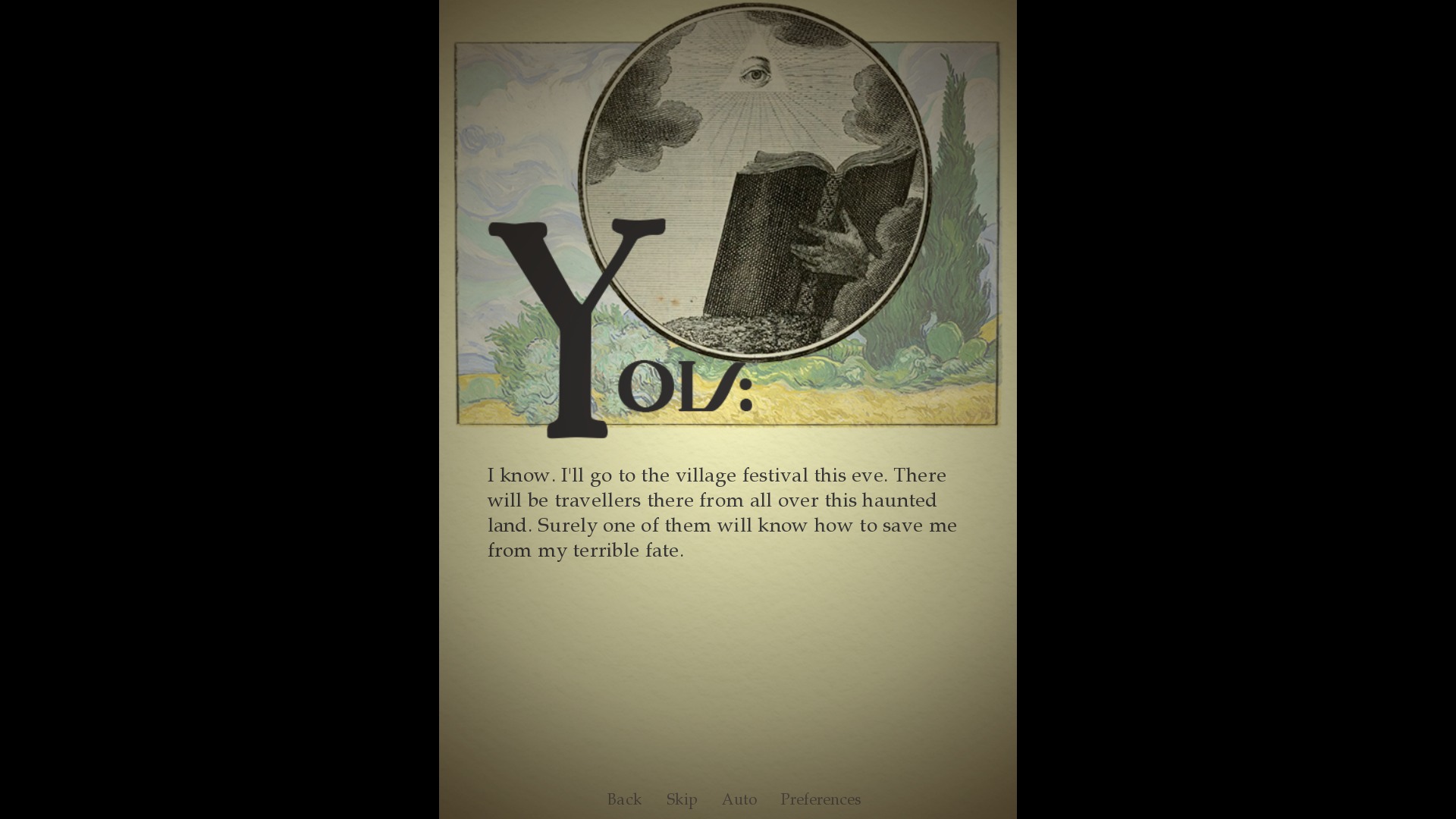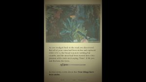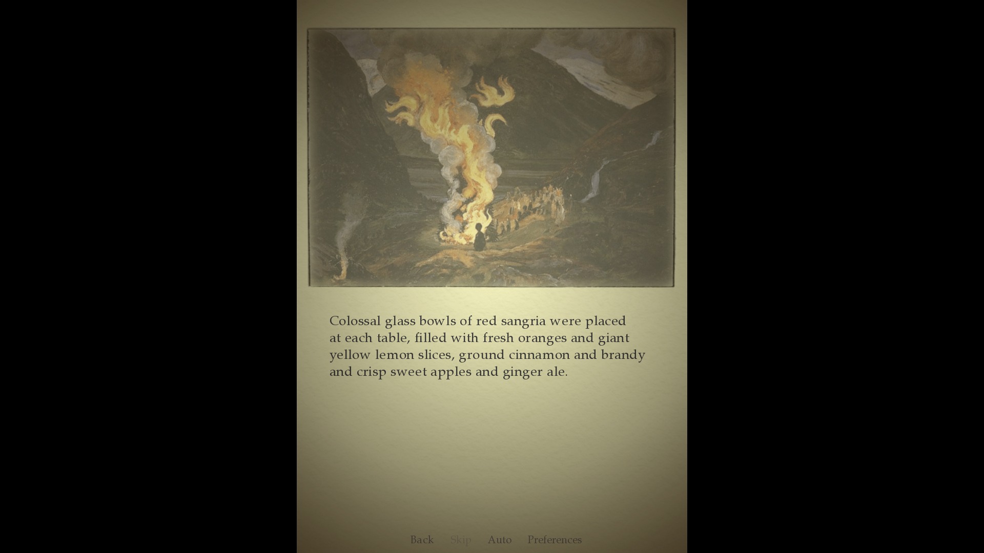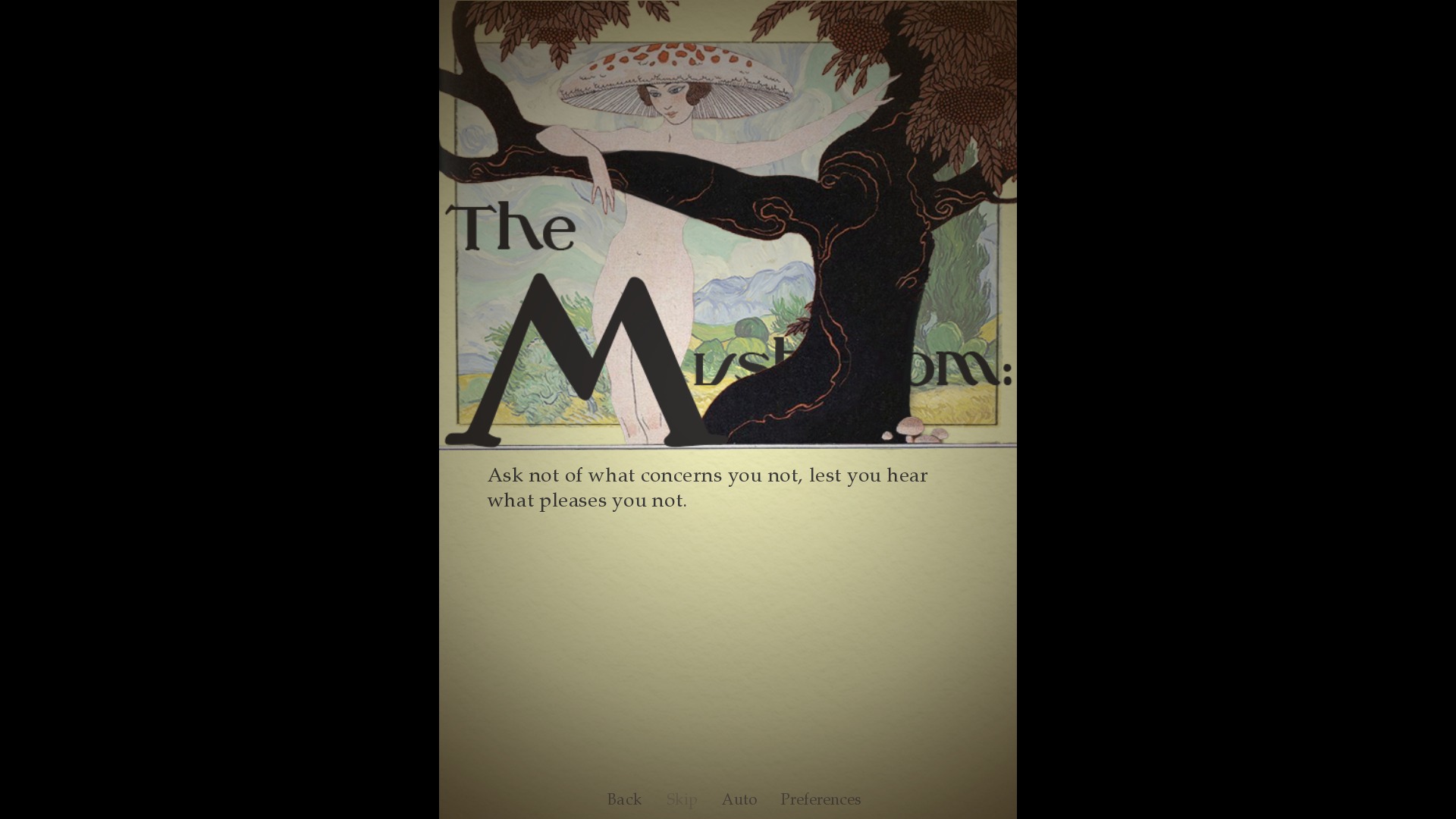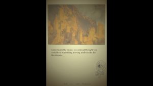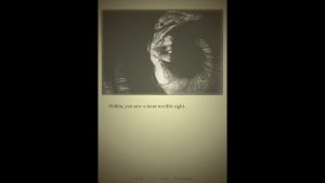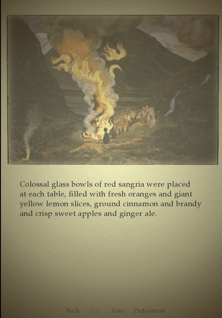 TWTM‘s “lost classic” feel is due in no small part to creator Jack McNamee’s imaginative writing style, and is reinforced with antiquated artwork from the public domain. These illustrations come from different artists and eras, and while the visual styles clash once in a while, it’s a mostly congruous experience. A few of these illustrations contain artistic nudity, so there is an “NSFW Filter” in the settings, but there’s not that much to be covered up in the first place. Music is scarce but fitting, with most of the game underscored by faint crackles of fire.