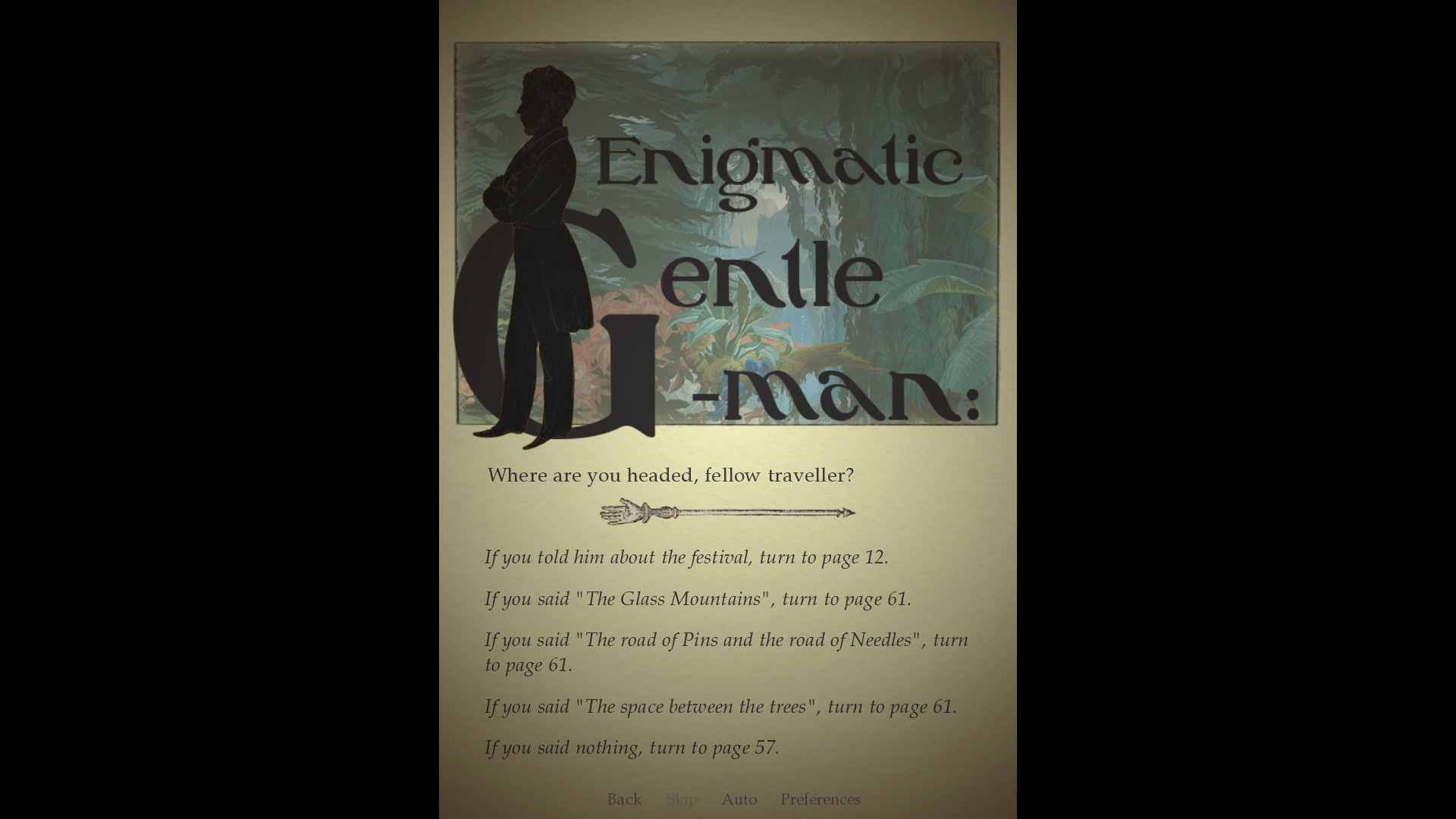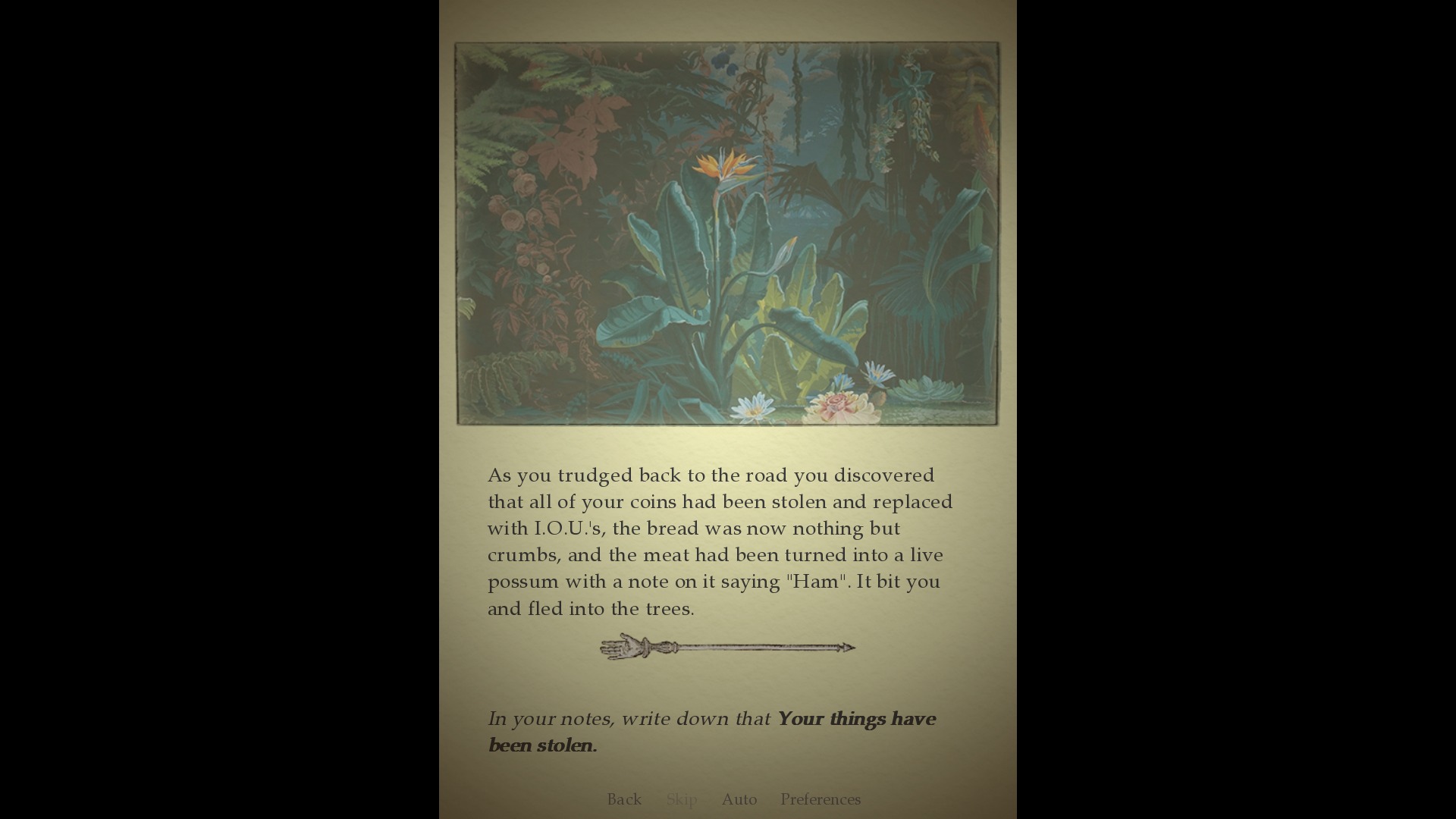 As a Ren’Py-made visual novel, TWTM is capable of logging the player’s status, but stays true to the gamebook style by making the player keep track. Of course, just like a printed gamebook, even if your status disqualifies you from one of your options, there’s nothing to stop you from picking it anyway. You can also double back to an earlier page if things aren’t going your way, as long as you haven’t hit a pivotal event flag. Whether you find cheating to hinder or strengthen the experience, there is an easter egg scene that expects it.