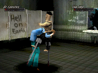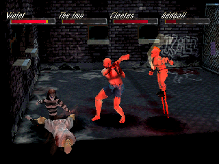 For the system the game it was released on, Thrill Kill looks pretty nice. The characters models are a little jagged, but they’re also recognizable from a distance. The game also keeps a constant frame rate no matter how intense the action gets, which definitely helps for a fighting game like this. As you’d expect, there’s also plenty of blood that spurts out of characters by the bucketful, and it even stains the floor when it eventually lands, which is a nice detail. Most of the stages, however, aren’t really as noteworthy, and most of them are basically just a big, square room with different textures slapped onto the walls to make it look more like an asylum cell, back alley, or dirty bathroom. The sewer level, ironically, is probably the most interesting, as there’s actually flowing water in the background to watch as you fight. What’s also a nice touch is how many alternate costumes the characters get, with every character except for the bosses getting a total of five. Some of these are pretty similar to each other, but the highlight would have to be the fifth costume for each character. These do things like put Belladonna in a cowgirl outfit, make Cleetus into a pirate, or make Violet into a big-headed, stereotypical alien.