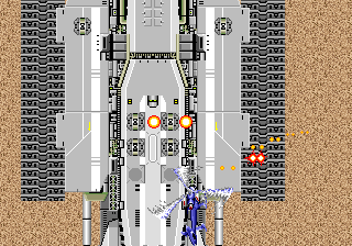 There are two 16-bit console ports. The Genesis version was released around the launch of the system and is called Super Thunder Blade, despite there being nothing “super“ about it. The first overhead section of each level has been cut out entirely. Instead, each stage starts off in the over-the-shoulder segment. To make up for this, these stages are longer and have a new mid-boss, similar to the one fought at the end of the arcade version. After defeating this, you go into an overhead view, but there’s no scaling at all. You couldn’t change altitude in these scenes in the arcade game either, so they play similarly. Once again there are only four stages, with the first, second and fourth being roughly identical to the arcade game, and the third being a brand new level that takes place over the ocean. There’s also a new final boss, fought in the overhead perspective. The targeting is also simplified, as missiles now home in on enemies.