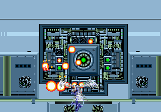 When you reach the end, the perspective once again switches to an overhead view, except now you can’t change you altitude. Your goal is to conduct a bombing run on a gigantic tank and/or jet, taking apart its turrets piece by piece. The only exception is the final stage, which ends in the over-the-shoulder perspective against a different variety of gigantic tank.