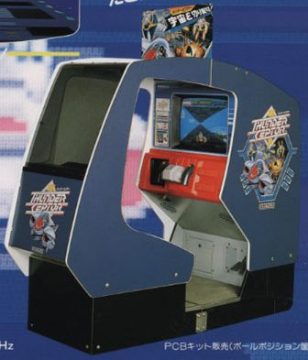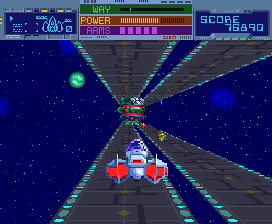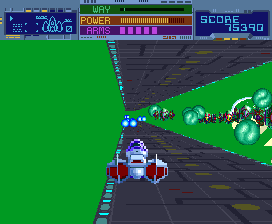 Later, the same year, Namco released a sequel-slash-revision, ostentatiously titled 3-D Thunder Ceptor II. The overall composition of the game is quite similar to its predecessor, though it does have some notable additions. The “tracks” are all new, with new formations of obstacles and enemies to fight, including the invincible flying panels from Xevious. Also on occasion, a friendly ship (the same as yours, except painted white) will zoom ahead of you and drop a power-up item. Power-ups can either refill a small chunk of your power bar, or render the Ceptor temporarily invincible and able to crash straight through obstacles without fear of damage. These powerups move quickly, though, and it’s very easy to miss them, especially if they get dropped right behind a large obstacle like an asteroid.