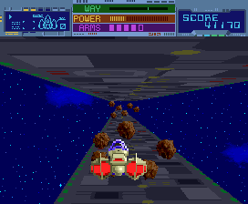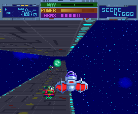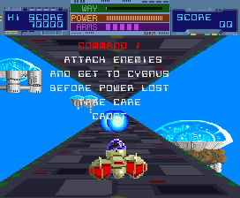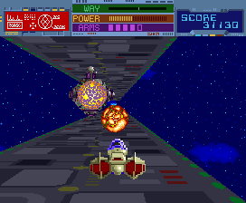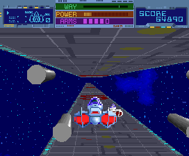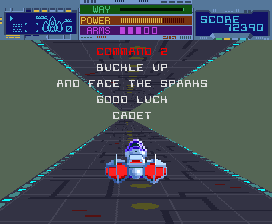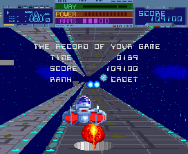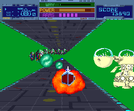 Later, the same year, Namco released a sequel-slash-revision, ostentatiously titled 3-D Thunder Ceptor II. The overall composition of the game is quite similar to its predecessor, though it does have some notable additions. The “tracks” are all new, with new formations of obstacles and enemies to fight, including the invincible flying panels from Xevious. Also on occasion, a friendly ship (the same as yours, except painted white) will zoom ahead of you and drop a power-up item. Power-ups can either refill a small chunk of your power bar, or render the Ceptor temporarily invincible and able to crash straight through obstacles without fear of damage. These powerups move quickly, though, and it’s very easy to miss them, especially if they get dropped right behind a large obstacle like an asteroid.