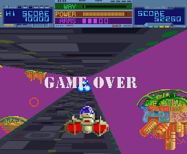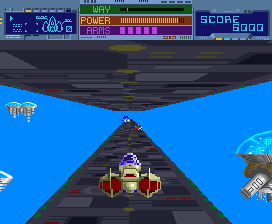 Thunder Ceptor combines elements from some of Namco’s previous arcade hits, namely Xevious and Pole Position. Your objective is to fly your ship – which is viewed from behind and can adjust altitude as well as moving left and right – from the start of the track to the end. The tracks never have any bends to them, but some have multiple “pathways” that present you with different arrays of obstacles. Most enemies and some minor obstacles can be destroyed with your ship’s blasters and smart bombs, but the majority of obstacles must be avoided and will only disappear if you crash your ship right into them. You do not get lives in Thunder Ceptor; similarly to Pole Position, you will continue to fly indefinitely, no matter how many times your ship explodes, until your constantly-draining Power reserve is completely empty, at which point your game is over.
