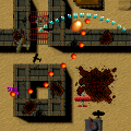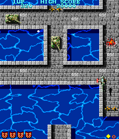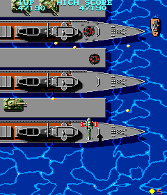 In Tiger Heli, you control a helicopter equipped with a very weak, short-ranged gun and destructible satellites. You fight against air and ground-based enemies (planes and tanks, respectively), but unlike Xevious or TwinBee, your main weapon can hit both types of targets. Tiger Heli is also the first shoot-em-up to introduce limited use bombs, which can huge amounts of destruction. These bombs are shown as carried on the actual helicopter sprite, as opposed to just a number in the status bar, as typically seen in other shoot-em-ups. These explosives detonate when fired or when enemy bullets hit them, sometimes annoyingly clearing the screen when you don’t need to. Your helicopter is also fairly sluggish, which when coupled with your underpowered main weapon and lack of other power-ups other than the satellites, turns it into quite a difficult game. You’re sent back to a checkpoint after dying, though it’s not very far back, usually a screen or two. It’s also very short, at four levels long, and it loops to a higher difficulty after the end.