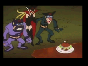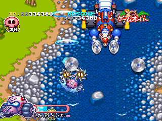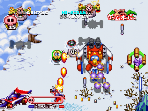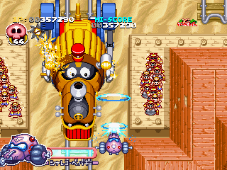 At the outset of Bokan to Ippatsu, you can choose from six mecha from the anime, with three original ones available later in the game, each with their own primary weapon and shield. After each stage, you need to choose a new one, so you get the opportunity to try out most of them. Each can also manufacture and toss an unlimited number of bombs, making for a powerful side weapon. However, these first need to be loaded on top of your vehicle, and if you take a hit when carrying it, then it can potentially blow up in your face. When your vehicle is destroyed, then the villain trio continues their assault riding on a weakly-equipped bicycle, though one more hit will send them blasting off, requiring another credit to continue. If you grab 100 skull icons in a level, you’ll also transform into an enormous mecha.