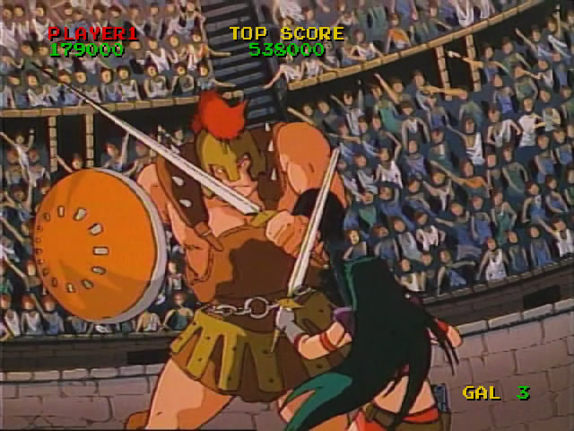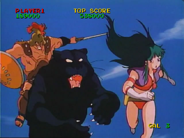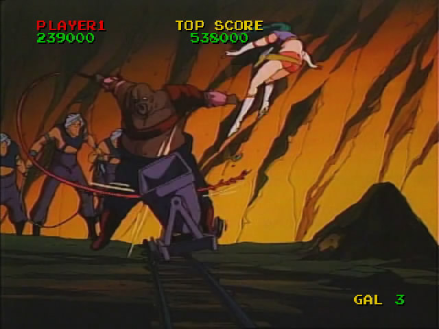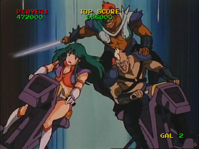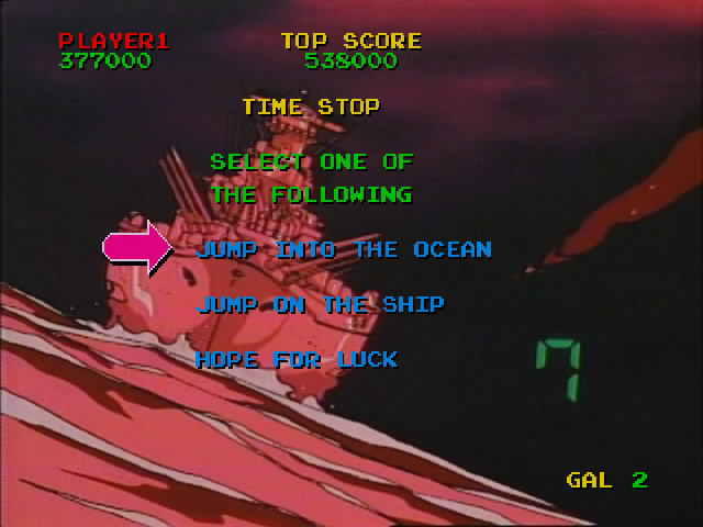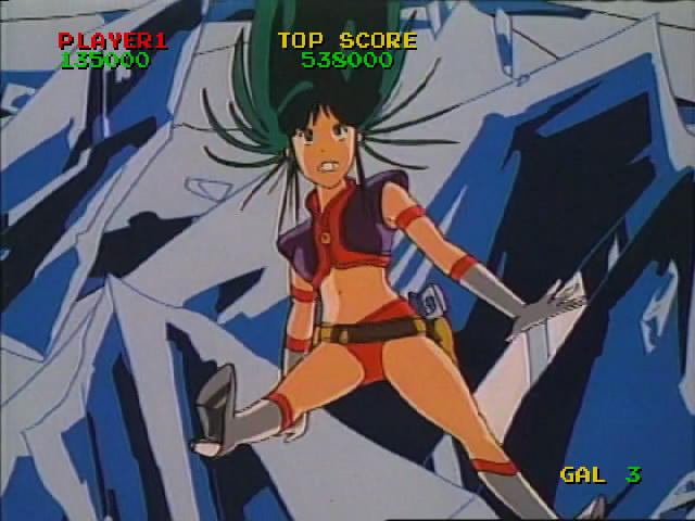 The game progresses much like the later Bluth FMV sequel Dragon’s Lair II: Time Warp did years later, with Reika leaping from time period to time period. While not as wacky or as outlandish as Time Warp‘s periods (like the Alice in Wonderland level), Time Gal shows a very loose interpretation of history. Each time period change is randomized, except for the last stage. Many scenes have mirrored variants to prevent too much memorization on the player’s side. The key gimmick that sets Time Gal apart from many other FMV titles is her Time Stop ability, which gives her a few seconds to choose the next course of action from 3 choices. Only one choice is the safe path, and it usually isn’t going guns blazing.