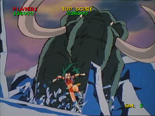 16,000 B.C. – A woolly mammoth emerges from the ice-covered tundra/iceberg and gives chase before Reika flips onto its back and rides it until it falls back into the cold watery brink, hopefully without the Time Gal in tow. This is the shortest stage in the entire game and is completed after 3 inputs.