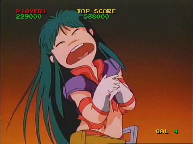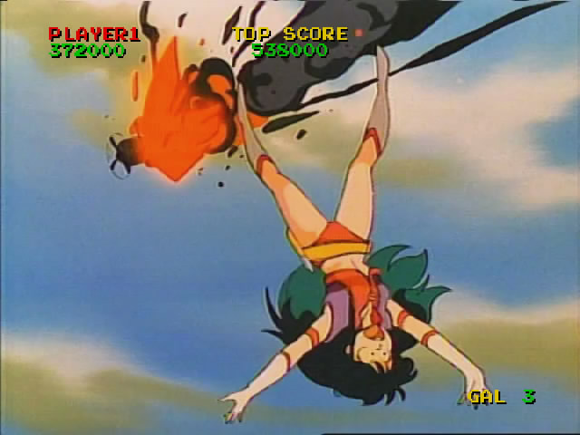 Well, it was sort of progressive, but not entirely 100% positive. Female characterization in video games has come under a lot of fire in recent years, and Reika is still a product of her era. Being a long green-haired gal in a half-vest top and red hot pants, she can be described as a blend of Yuri from Dirty Pair, Lum from Urusei Yatsura, and a hint of Milia from Macross. She’s flirty, generally cheerful as she giggles and skips through danger for most of the game, dolling out little quips here and there, with some shrieks of panic when in distress. Her outfit can even get torn off at times when you miss an input. In essence, she embodies what constituted mid-80s anime hotness, for better or for worse.