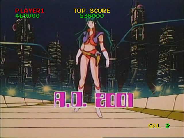 At some point between the 21st century and the 41th, time travel has become a possiblity, and as Timecop, Back to the Future Part II, and Bill and Ted’s Bogus Journey taught us, it is a potentially dangerous tool when placed in the wrong hands. In 4001 AD a criminal named Luda steals an experimental time machine in order to change history and seize power. Fortunately, Reika Kirishima, a.k.a. Time Gal, is able to follow him to the past with her own, much-smaller time traveling medallion on her chest and a laser pistol at her side. Not exactly a deep plot, but enough to justify the perils she’ll face throughout the interactive feature.