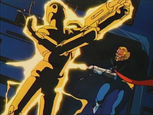 3001 A.D. – Another space station, this time seen from the inside. A giant robot beams in behind Reika, Star Trekstyle, and blasts at her. Reika somehow grabs a hover board, and goes on a high-speed chase with the robot.
