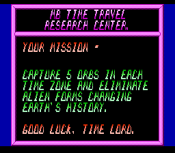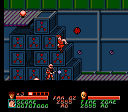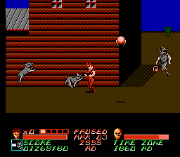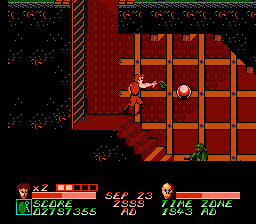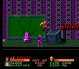 The first stage takes place in the future in the MB (presumably Milton Bradley, the publisher) Time Travel Research Center, right before you begin your journey to the past. The game is presented from a skewed angle, similar to a Double Dragon-style belt scroller, but it’s not really a beat-em-up, owing to both how it plays and how the levels are structured. The stages are non-linear, requiring you to hunt down all of the orbs. The stages scroll in all directions, so you need to jump around a lot, and there’s quite a bit of ground to cover even though most of them technically aren’t all that big. Finding all of the orbs to unlock the next stage is incredibly simple here in the first stage, as they’ve conveniently been dropped on the steps leading up to the time machine. A good start!