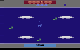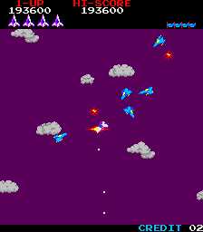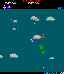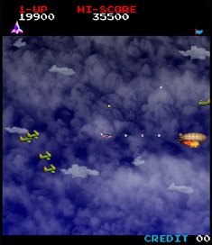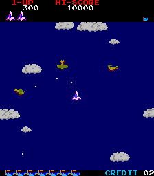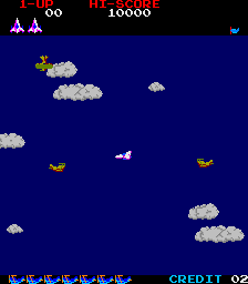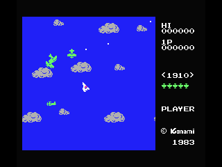 You begin in 1910 AD, moving to 1940, 1970, 1984, and then finally 2001, which must’ve seemed so far in the future back in 1982, when this was made. For the most part, the only real difference between the eras are the color of the backgrounds and the enemy sprites (going from biplanes to helicopters to jets), although they all attack the same. In the final stage of 2001, though, the sky is dark black, and all of the enemies are UFOs. How foreboding. After defeating this stage, the game then loops. Certain enemies will eject from their planes, and picking them up will yield extra points.