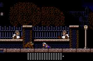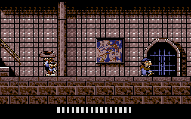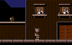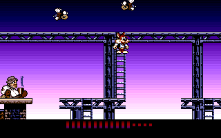 Les Aventures de Moktar was endorsed by Lagaf’ himself and the sprite of Moktar is directly based on the stereotyped Arabian outfit that he wears in the song’s bizarre video clip. Said clip contains some video game-style animations, that might even have been taken from a beta version of the game. Eventually the developers realized that nobody outside France ever heard of Rouil and his song about some Arab dude, so they decided to re-release the game in 1992 as Titus the Fox, replacing Moktar and La Zoubida’s sprites with their cartoony mascot and his vixen girlfriend Foxy. Everything else remained mostly the same, besides the image of Moktar in the intro being redrawn as the fox and a couple dark-skinned enemies being recolored and given less caricatured appearances.