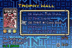 Between each stage, the Ninja Turtles can walk freely around their sewer hideout and a small portion of the surface. This opens for further customization and upgrades to each character. On the surface level, there is a Sports shop which sells items which can increase the movesets, enable new abilities and also gain more experience. In the sewer hideout, there is a sandbag hanging from the ceiling which can help power up the turtle of choice, and there are even achievements in the game which unlocks different pieces of TMNT memorabilia that can be accessed from the trophy shelf. Achievements can be accomplished by performing certain in game tasks, such as beating a set number of specific kids of characters or picking up a number of specific items. Some achievements are also accomplished simply by beating a stage. Once the game is beaten, the save file can be loaded to play the game multiple times to unlock more achievements.