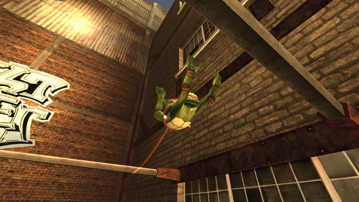 The platforming portions make up the majority of the game, and are quite apparently inspired by Ubisoft's reboot of Prince of Persia, which at the time of its release introduced the acrobatic platforming mechanics that is much more stylized in this game. Wall running, high climbing, double jumps and scenic acroatics with the use of pipes and poles are featured on virtually every stage. Similar to the way it is displayed in the actual movie, the leaner, gecko like movements of the Ninja Turtles make them flow with efficiency and speed in a very appealing fashion. Stages are marched on a linear path with a fixed camera which in theory is there to give every area a more distinct feel and look to make the jumps and gymnastics less repetitive and to give the overall game a cinematic feel. Most of the actions are performed by a single button press along with the D-pad. Each turtle also bring individual skills that are used on their particular stages to give some variety. Some areas will also require the brothers to work together to perform slingshots and other team up moves to progress.