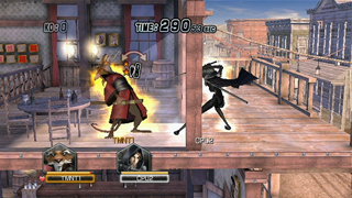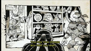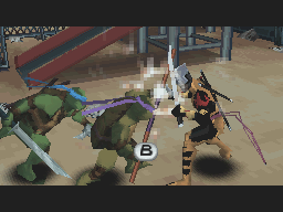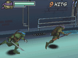 Being a mini-game, Ninja Adventures goes on for two stages of sidescrolling action, much like Kung-Fu Master, though also with some platforming elements. The first stage is on top of a New York city metro train car where the Ninja Turtles have to battle the Foot and also jump from car to car without falling inbetween. The second is on rooftops leading to the final destination of the mysterious shipment. Each turtle is selectable on the fly, and each of them have the same basic attacks and jumping capabilities, and there is also a brother meter in this game which fills up to allow for team moves. To end the game, the turtles must deal with the secret of what lies within the crate brought in by the Foot.