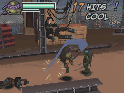 In Combat, the turtle is situated center screen and must take out holographic men in suits wearing towels on their heads by pressing 4 or 6 repeatedly, or 2 in order to jump and attack. Certain enemies will drop special items which can be used to refill energy, and there is also a special meter that fills up; when full, it can be used to launch a shellshocker attack using the 5 key.