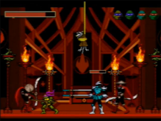 Before each of the 15 stages, there is a choice of any of the four turtles and an extended set of team characters, all with their special team ability. The turtles themselves have the same moves, though they have individual strengths that factor into the choice on some stages. Leo and Don have the long range weapons, with Leo's katanas being more effective towards Foot Clan foes and Don handling machine-based enemies better. Mike and Raph have shorter range weapons, though their overall strength is signifigantly better than that of Leo and Don.