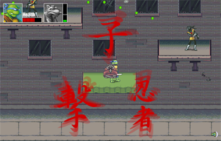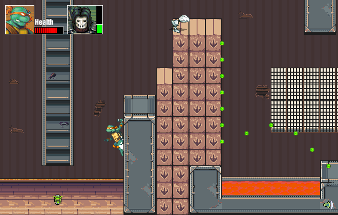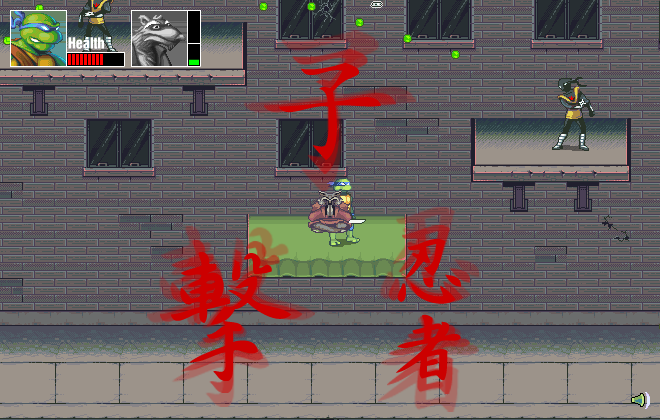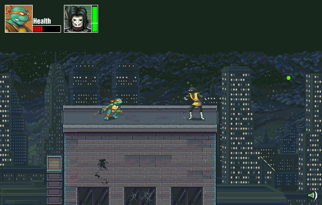 The game controls entirely with the use of the arrow buttons along with A for strikes and S for team specials. Each turtle has the ability to double jump, which becomes very useful across the New York rooftops, and they can also wall-jump Ninja Gaiden style to climb narrow spaces. In order to pull off the team special, the team meter on the top left corner must be filled up, either by collecting green pellets or ooze canisters on each stage, or by beating enemies. There is also a Mario-style ground pound move that can be performed mid air by pressing Down and Attack.