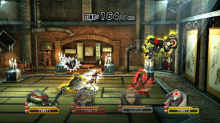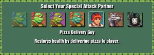 As team members, each of the turtle characters have different advantages as well, with Leo attacking all enemies with equal amounts of strength and Raph striking the screen on a straight path with extra power towards the Foot. There are also additional characters available to partner up with: Splinter, who will unleash a devestating screen-encompassing attack; Casey Jones, with his super attack along a straight path; and the greatest support character in TMNT's long history, the unnamed random Pizza Delivery Boy who will come on screen to deliver a life-replenishing pizza.
