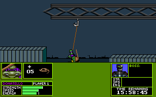 Controls and combat is done in a rather finicky way, one that takes some practice to get used to. Played entirely with the keyboard, the arrow keys will move the turtles around as commanded, when Enter key, the arrow keys turn into attacks (think International Karate). Each direction towards the enemy will trigger different attacks designated either upwards, thrusting forwarded or downwards depending, and the more presses are done, the more attacks is performed. When holding Space, the turtles go into a defense mode which works in the same way as the attack mode though defensively instead. While in these states of combat, the brothers will not move and they will be virtually defenseless while moving, so it is essential to get used to the different modes in order for them to properly navigate and combat. Most of the game is not linear, and allows for a mostly free set path of progress, though certain items need to be acquired before some sections can be fully ventured. Each stage will feature an end boss, sometimes preluded by a cutscene. Some sections also makes use of additional items, like the grappling hook.