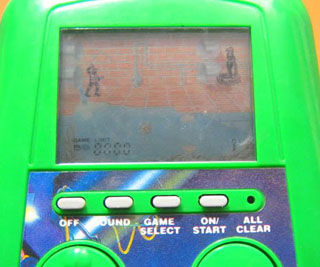 Grandstand's game takes place in an intersection with at a slightly isometric angle and throws bad guys at the TMNT from each direction. There are 9 levels to play through with each level having rapidly faster enemies the higher you go, and the high score is saved even when switched off. Like most LCD units, it also features incredibly loud sound and a small clip of the intro music from the cartoon. It was only released in the UK and some Northern European countries.