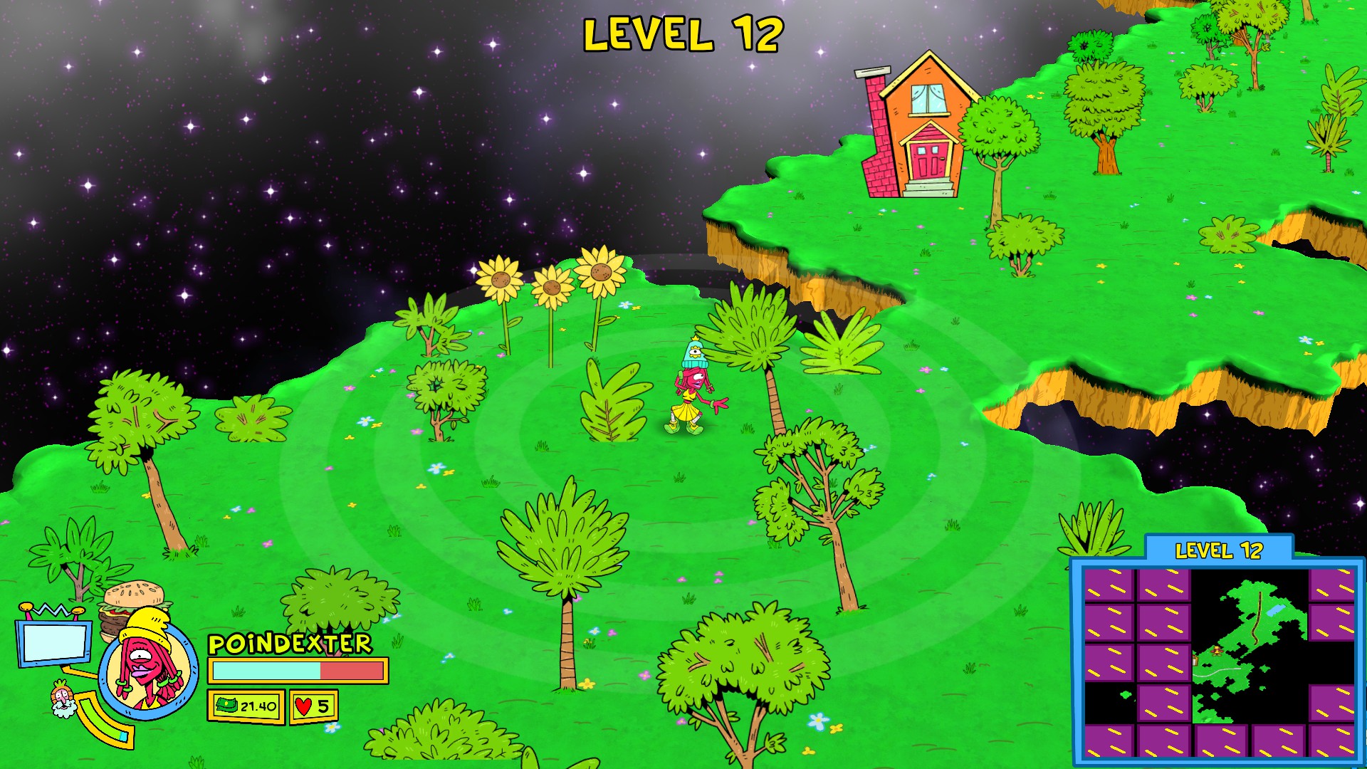Toejam & Earl have gone on another joyride to Earth, joined by Latisha (returning from the third game) and new friend Lewanda. When Earl ends up pushing the wrong button in their ship, it creates a black hole, splitting Earth into 25 floating chunks and scattering the pieces of their ship far and wide. Your goal once again is to climb your way to the top of the floating islands and collect the ten missing spaceship pieces. Of course, you’ll have to evade a horde of hostile Earthlings on your way to the top, using whatever equipment you can scavenge to keep yourself safe. While previous games are alluded to at times, the core concepts are so similar that one could consider Back in the Groove a remake of sorts to the original game.