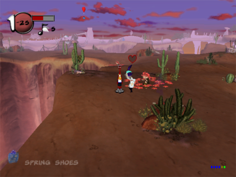 The game structure’s much closer to the first game, with most everything that has introduced with the second game getting removed. You’ve got a bunch of randomly generated levels, populated with presents, earthlings, and the records you’re supposed to be collecting. Instead of the game being split into a linear set of levels, however, you’ve now got a HUB world that leads to other levels. Since every level is now part of its own separate area, falling off a cliff will now just cause a very small amount of damage instead of kicking you to a previous level. The presents are once again kept in an inventory, with certain ones having a chance to backfire on you and do something bad. The rocket skates, for example, will give you extra speed, but if they backfire, they’ll become nearly impossible to actually control.