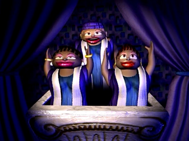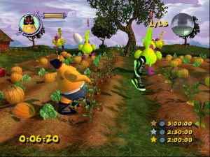 It’s not all bad, however, since you’ve got weirdness like an Arnold impersonator who will constantly remind you that the only way to get buffed up is to download the game’s DLC. (Thank goodness this game was before the age of microtransactions.) Some of the friendly NPCs also make a return, like the old man in a carrot suit. (He has his reasons, apparently.) What nearly ruins the game, however, is that before every level, you get a cutscene of a bunch of badly-rendered gospel singers singing about the general objective of the level. These aren’t funny in the slightest, and even though you can skip these scenes, you really have to wonder why they were included in the first place. The way different Earthlings will say different things to each character is pretty cool, even if it leads to lines like “What is up, homie Earl man?”