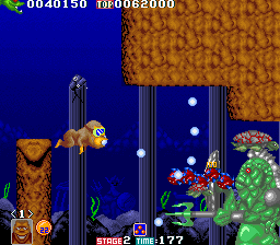 The game itself resembles some of Irem’s side-scrolling action games like Legend of Hero Tonma, in that the main character dies in a single hit, and resurrects at a nearby checkpoint. Luckily, here these checkpoints are regularly placed, so even though you might find yourself getting killed often, at least you’re not punished too harshly. It does become more of an issue with the boss fights, though, at least until you’ve discovered their pattern. Toki’s relatively large size combined with the size of some enemy projectiles can make navigating between them fairly difficult.