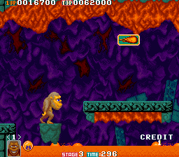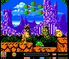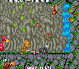 The graphics are colorful and the designs are consistently amusing, thanks to the excellently weird spritework. The main theme music is catchy, though the loop is a little simple and quite short. It’s also repeated far too often within the game, so it does wear out its welcome by the end. The sound effects are digitized samples, many sounding like they came out of a Looney Tunes episode, which is one of those things more commonly found in Western PC games than Japanese arcade titles, but nevertheless adds to Toki‘s eccentric charms. The game over screen challenges the arcade Ninja Gaiden‘s famous screen by showing a video screen (which exist in this world, apparently) with Miho desperately crying at you to keep playing or else she’ll be killed.
