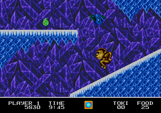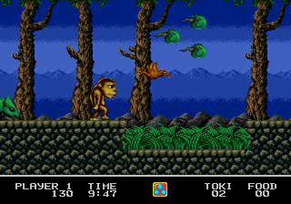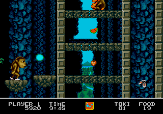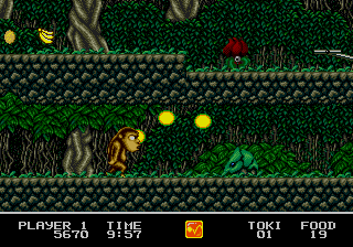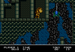 Toki attacks by spitting…something. Let’s just say they’re video game bullets. Various power-ups improve his abilities temporarily, including three-way shots, more powerful wave beams, charge attacks, and the ability to breathe fire. These attacks are also quite versatile, as you can shoot upwards and diagonally (though not directly below). In a curious control quirk, this only works when you’re on the ground, and Toki can only shoot left and right when jumping. Toki can also harm enemies by jumping on their heads, a standard platformer convention, which not only gives him an extra method of attack but can also be used to obtain otherwise out-of-reach items. Grabbing 50 coins, mostly dropped by enemies, will also yield an additional life.