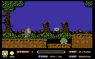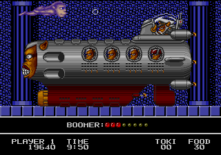 There were plenty of prehistoric themed sidescrollers in the late 80s/early 90s – Hudson’s Bonk’s Adventure, Titus’ Prehistorik, Data East’s Joe & Mac – but none are as quite as delightfully deranged as Toki. The hero himself strolls along with an unusual saunter, head drooped below his shoulders, with exaggerated facial features at every spit. One of the power-ups is an American football helmet (to shield from damage); another is a pair of white sneakers (to walk faster), both of which look ridiculous when worn. The enemies are far stranger than the unlikely hero – sure, there are other apes to face, but there are also things like flying sting rays. Right in the first stage, there’s a gigantic floating contraption, with faces that spit out steam and gloves that punch downward. As you destroy each piece and climb upwards, you see that it’s powered by two monkeys tugging on a lever like a seesaw. It’s just so bizarre that it sets the stage for the adventure ahead.
