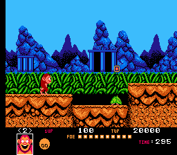 The most memorable boss is a gigantic wrinkled raisin-thing who attacks by yelling the letters “BURP”. The second most memorable boss is a disembodied pair of hands and feet, with a heart floating somewhere about its midpoint. Oddly, in spite of the quasi-prehistoric setting, there aren’t any actual dinosaurs to fight against, though there are plenty of strange ruins to explore, the final one decorated with statues of what appears to be some kind of goat god. Each of the game’s six stages has a boss at the end and most have at least one mid-boss, so there’s a good variety of oddball foes to contend with.