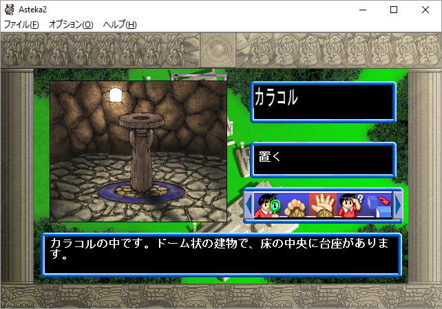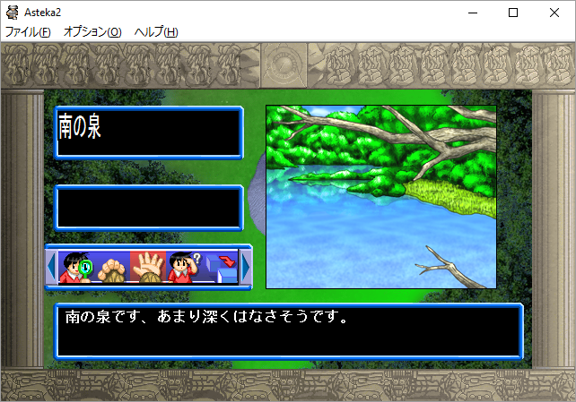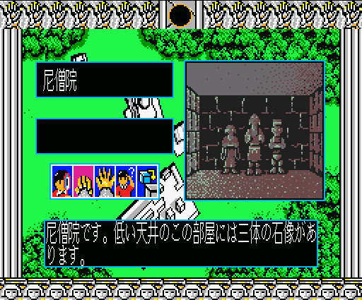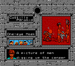 Asteka II: Templo Del Sol (also known as “Taiyou no Shinden” or “Temple of the Sun”) was released for the computers in 1986 and the Famicom in 1988. This entry ditches the text input and drastically modernizes the interface. The Famicom version was designed by Compile and published by Tokyo Shouseki, who later became known as Tonkin House and did several other Falcom ports (including Romancia for the Famicom, and both Ys III and IV for the Super Famicom.) In Famicom release, you play as two young explorers – whom you get to name – who are investigating the disappearance of their lost uncle in South America. Most of the game is displayed in a first person viewpoint, with the various command icons on the side of the screen and the text on the bottom. These sections are pretty much just like the adventure game Shadowgate. However, when moving from location to location, the perspective switches to an overhead view, as you walk from ruin to ruin.