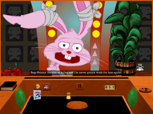 The world design is quite well done. The adventure gets off to a good start taking place in The Lands Above, which seems stuck in a perpetual twilight but is no less gorgeous because of it. Escarpa seems to take inspiration from American Indians, as the residents have their homes built in the side of a gigantic canyon. Alas, things stumble somewhat during the mid-game – Pergola is a forest where Torin is captured, Gulliver’s Travels-style, by a race of tiny creatures, while Asthenia is a standard volcano world. Both feature consistently excellent artwork, but Pergola focuses entirely on solving stupid little puzzles by moving around the miniature cretins, with little to explore, while Asthenia has no character interaction whatsoever. Thankfully, the story picks up in the final chapter in the core world of Tenebrous. For all of the talk in-game of how depressing this world is, it’s not all that dark. Half of it takes place in a bright pleasant forest – the other half takes place in the backstage of a theater, where you get to interact with more of the land’s bizarre residents.