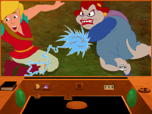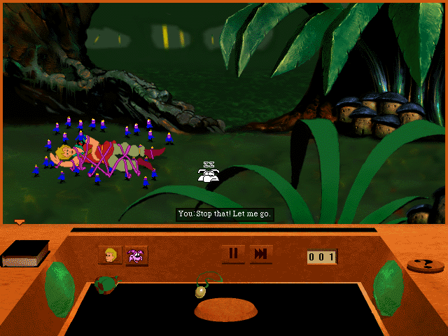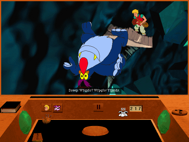 Still, at least the game looks fantastic. The painted backgrounds are gorgeous, and the character designs capture the look and feel of the best animated flicks without relying on too many standard Disney tropes. While the adventure sequences look like standard Sierra games in high res, there are numerous close-up cinematics during the dramatic scenes. They’re rendered in-game, so they don’t suffer from the compression artifacts of full motion video, and they’re well animated too. While Torin is a fairly generic blond fantasy hero, the rest of the characters are appropriately exaggerated, with the most amusing being Dreep, Lycentia’s hulking goon. He’s technically quite dangerous, in that he can eat Torin in a single bite, but he’s so damned goofy looking, with his large blue face and gigantic red nose. It’s like something that crawled out of the imagination of Jim Henson, making it hard to find him threatening.