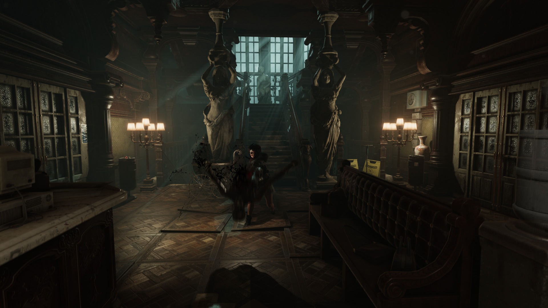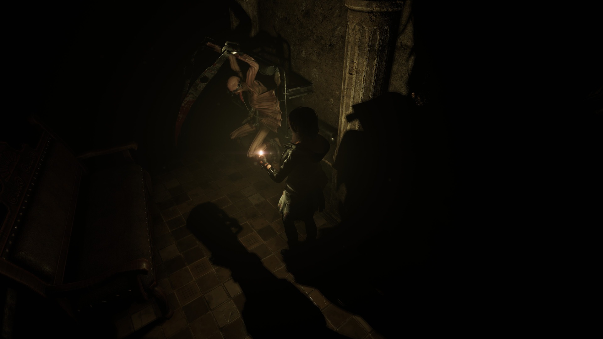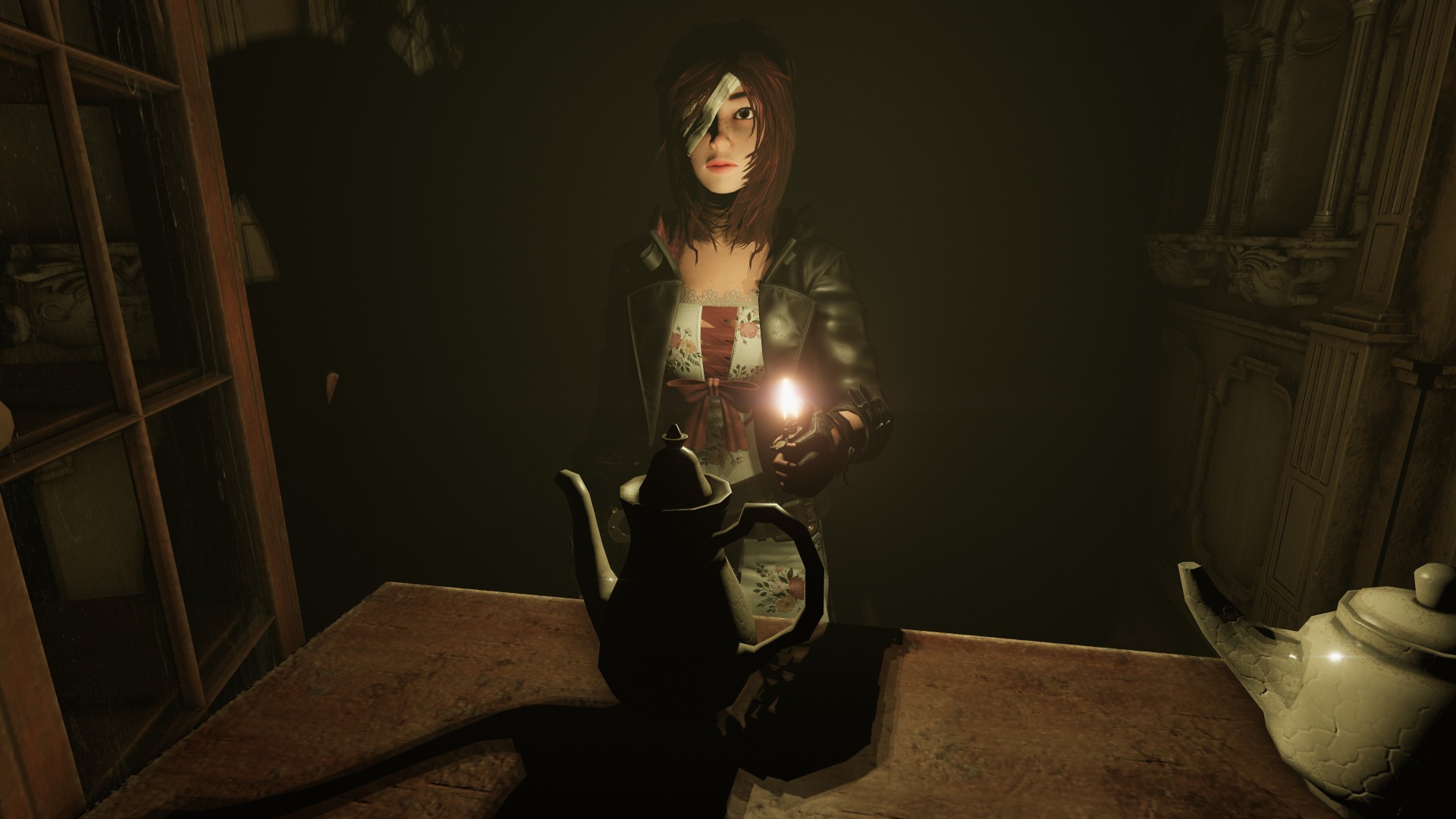 Darkness is everywhere, and it even serves as a gameplay element. Being in pitch darkness for five seconds without a light source results in an instant death scene of Caroline being dragged away. You can use your lighter to see in the dark, but you can’t equip both your lighter and a weapon at the same time. So naturally, there are enemies in the dark, requiring you to avoid them until you can either light candles or turn on the lights in the room. Later, a body-mounted flashlight you can wear solves this problem, allowing you to enter the game’s pitch-dark locations and fight enemies at the same time.