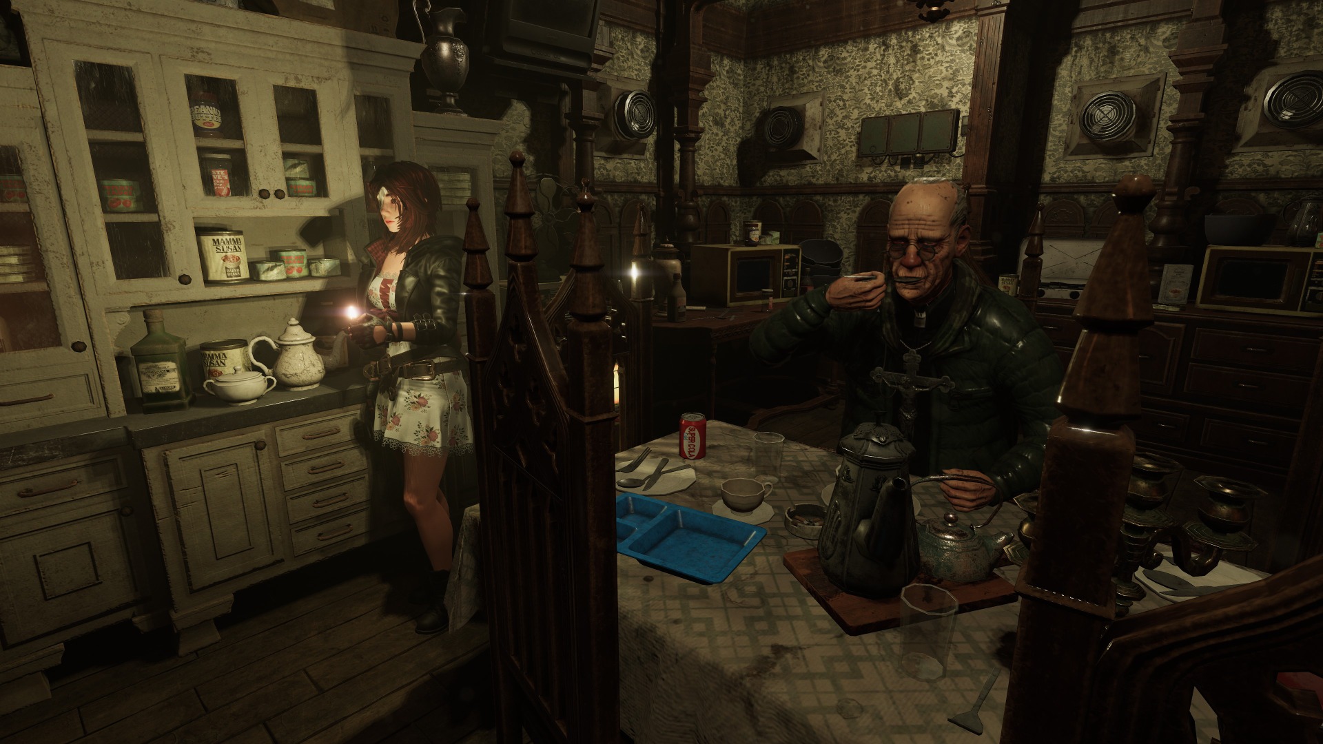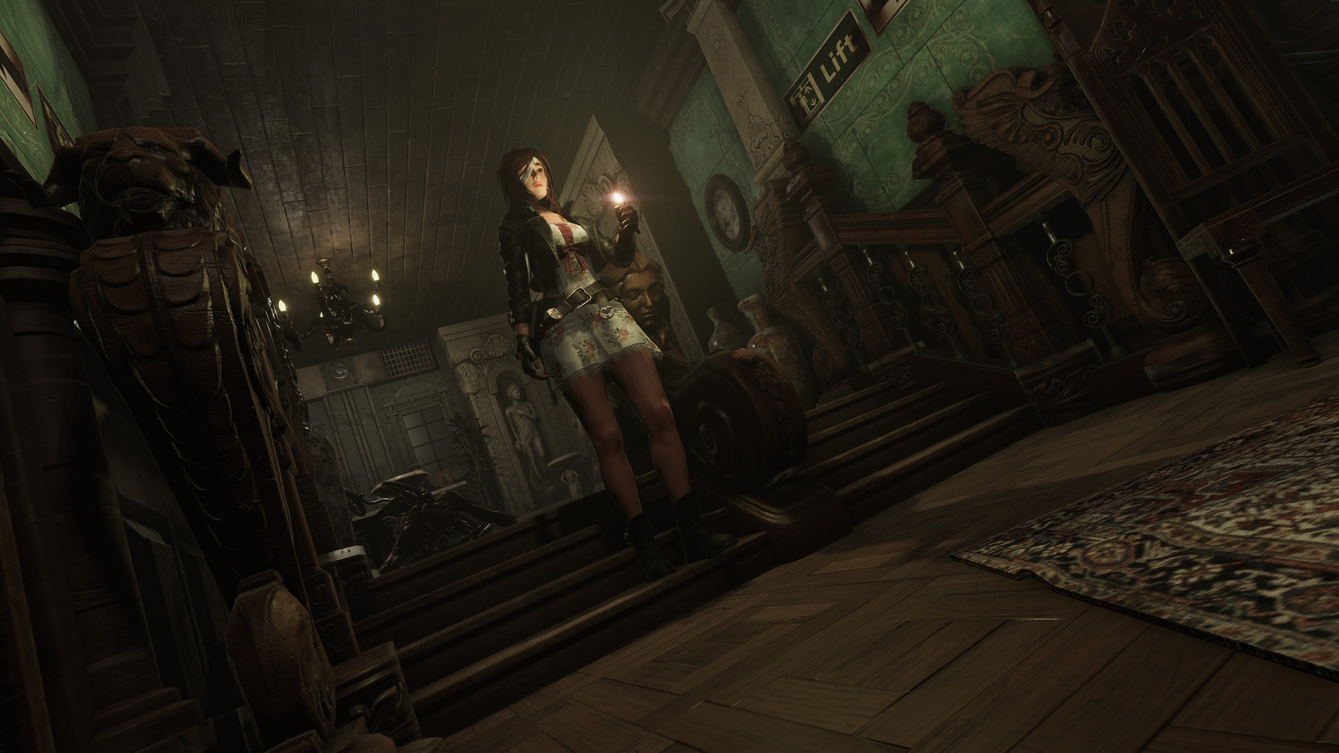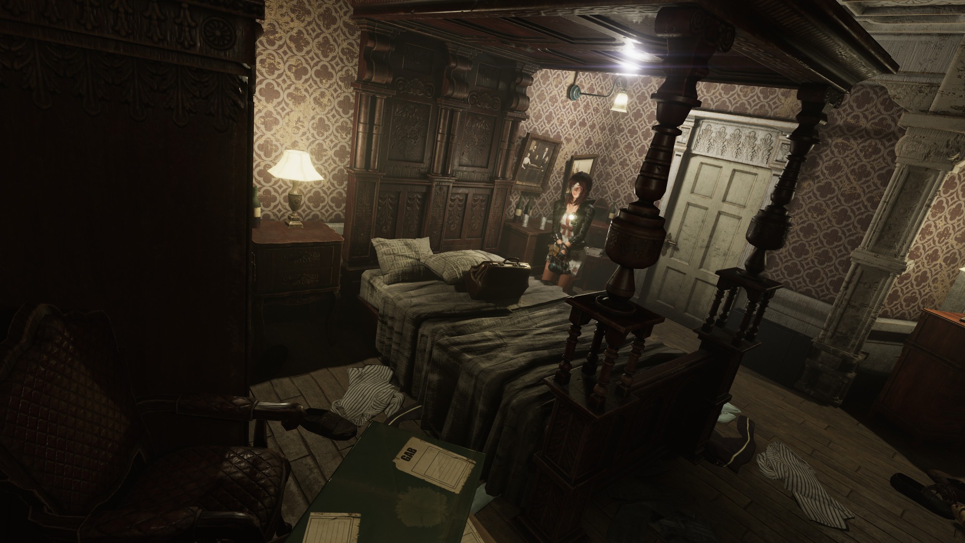 Darkness is everywhere, and it even serves as a gameplay element. Being in pitch darkness for five seconds without a light source results in an instant death scene of Caroline being dragged away. You can use your lighter to see in the dark, but you can’t equip both your lighter and a weapon at the same time. So naturally, there are enemies in the dark, requiring you to avoid them until you can either light candles or turn on the lights in the room. Later, a body-mounted flashlight you can wear solves this problem, allowing you to enter the game’s pitch-dark locations and fight enemies at the same time.