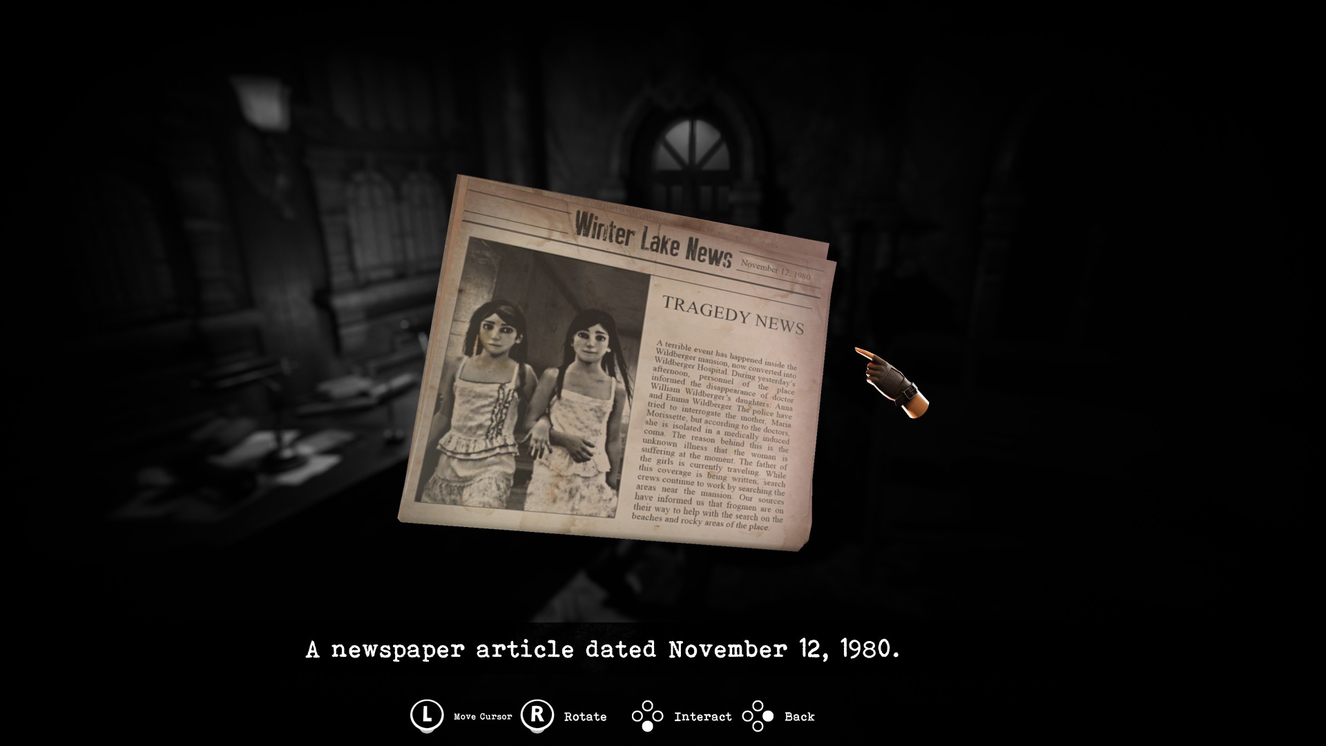 The story begins in December 1994 with Caroline Walker, a Canadian woman, receiving a photograph in the mail of two twin girls that prompts her to find out what is happening with them. As she enters the mansion/church/hospital, she is knocked unconscious. She wakes up nude in a bathtub, to find her right eye has been cut out, her face bandaged up, and a tube has been inserted down her throat. Getting up, Caroline quickly gets dressed and solves the game’s first puzzle before leaving the bathroom, now with many questions that need to be answered. She soon finds her first weapon, and its accompanying, fourth wall-breaking instruction sheet. Close by, she gets to test her new equipment on her first enemy.