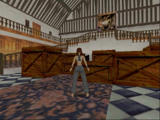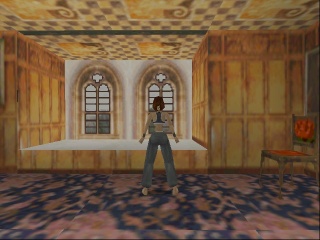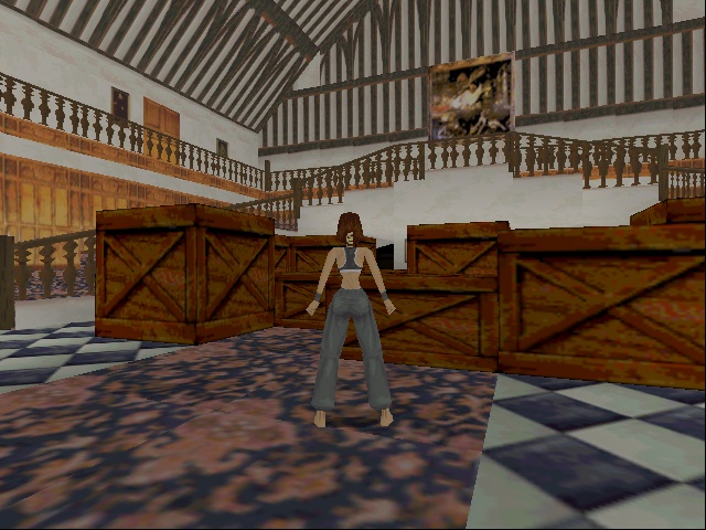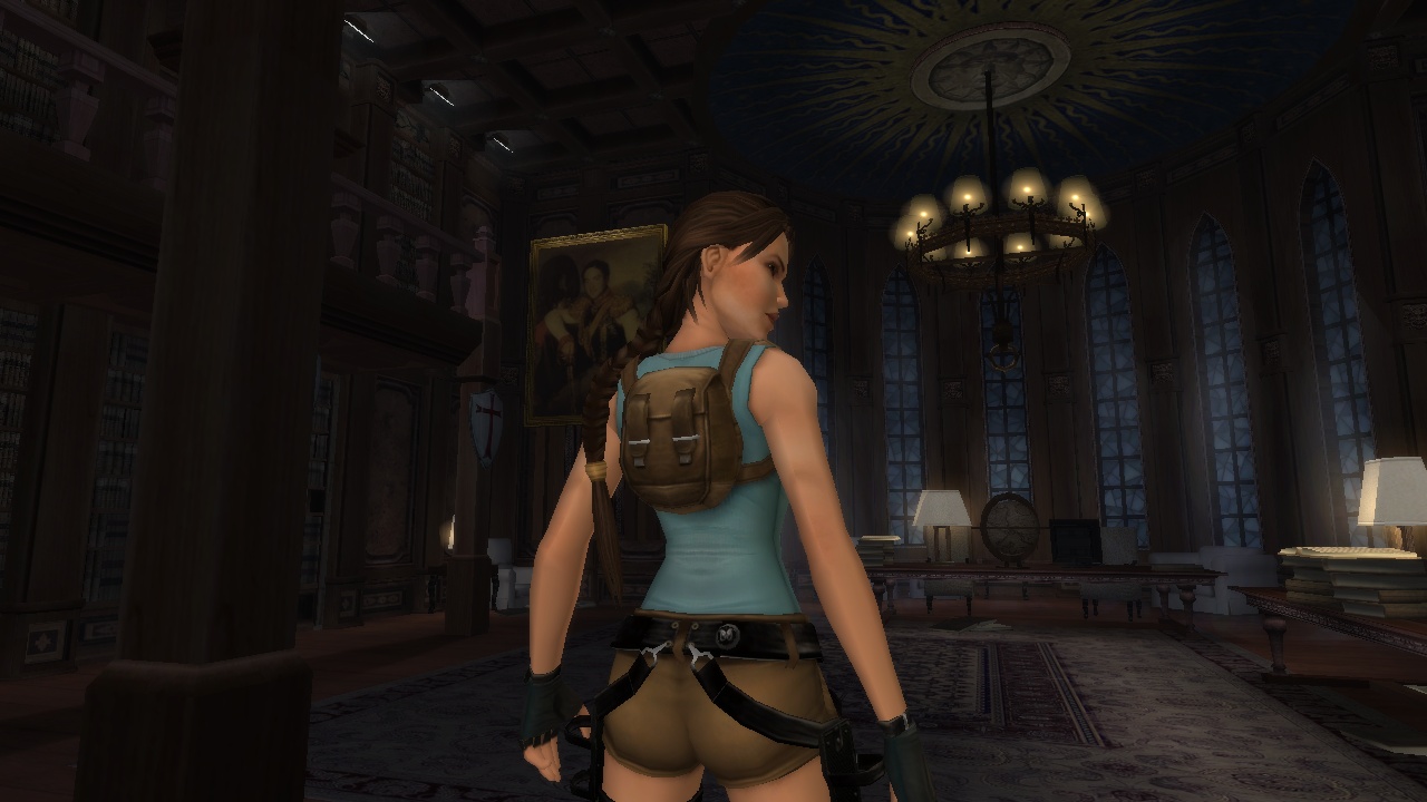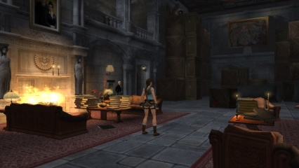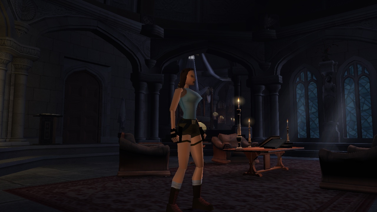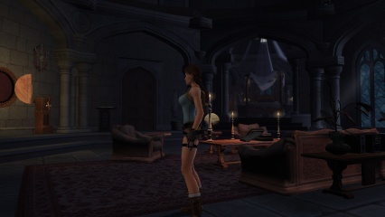 The main hall now serves as a proper living room, although there's still a bunch of crates in the corner, which were all that was there in the original - save for the Ark of the Covenant, which used to stand there inconspicuously, but is now gone. As can be seen on the screenshot, the butler now also follows Lara around some rooms, which was a feature first added in Tomb Raider 2. |