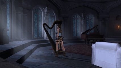 Originally the master bedroom just consisted of a single room that also included the library, and three of the four doors in the upper story were locked permanently. Now the bedroom alone consists of two rooms and a walk-in closet (where it's possible to chose from several unlockable costumes), and the now separate library spans two large rooms as well. |