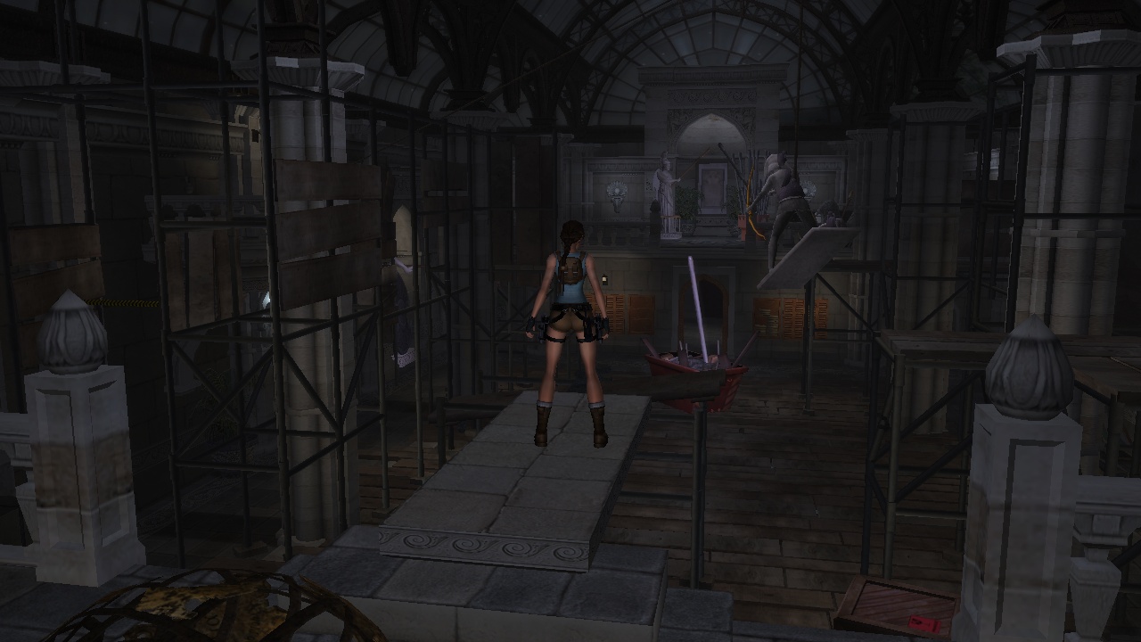 Lara had turned the former ball room into her main gym to practice all kinds of jump maneuvers. In the original, it's just a bunch of ramps and boxes, but gets turned into an impressive installation of climbing walls, mats and poles, to account for all the new moves added to the game. There are no traces of a ballroom left. |